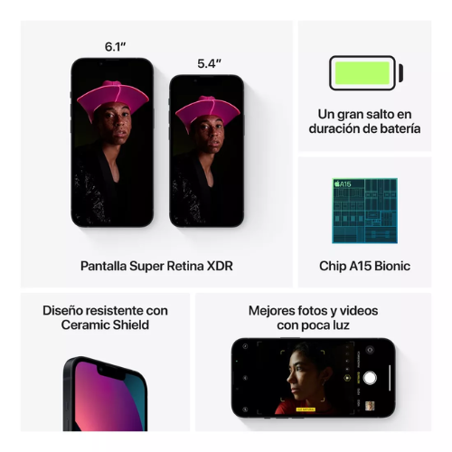 Su pantalla Super Retina XDR de 6.1" ofrece colores vibrantes, alto contraste y gran nitidez, ideal para contenido multimedia, juegos y uso profesional. Gracias al chip A15 Bionic, su rendimiento es rápido y eficiente, asegurando fluidez incluso en tareas exigentes y aplicaciones de alto nivel.